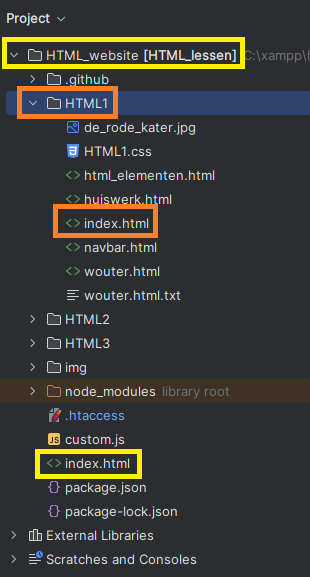 Wij willen graag meerdere opdrachten/projecten verzamelen onder één groot 'verzamelproject' (hoofdpagina). Om Dit te doen maken we eerst een hoofdpagina (met index.html, opmaak, etc.) en vervolgens willen we graag onze andere projecten eraan toevoegen in aparte mappen (zie afbeelding).
